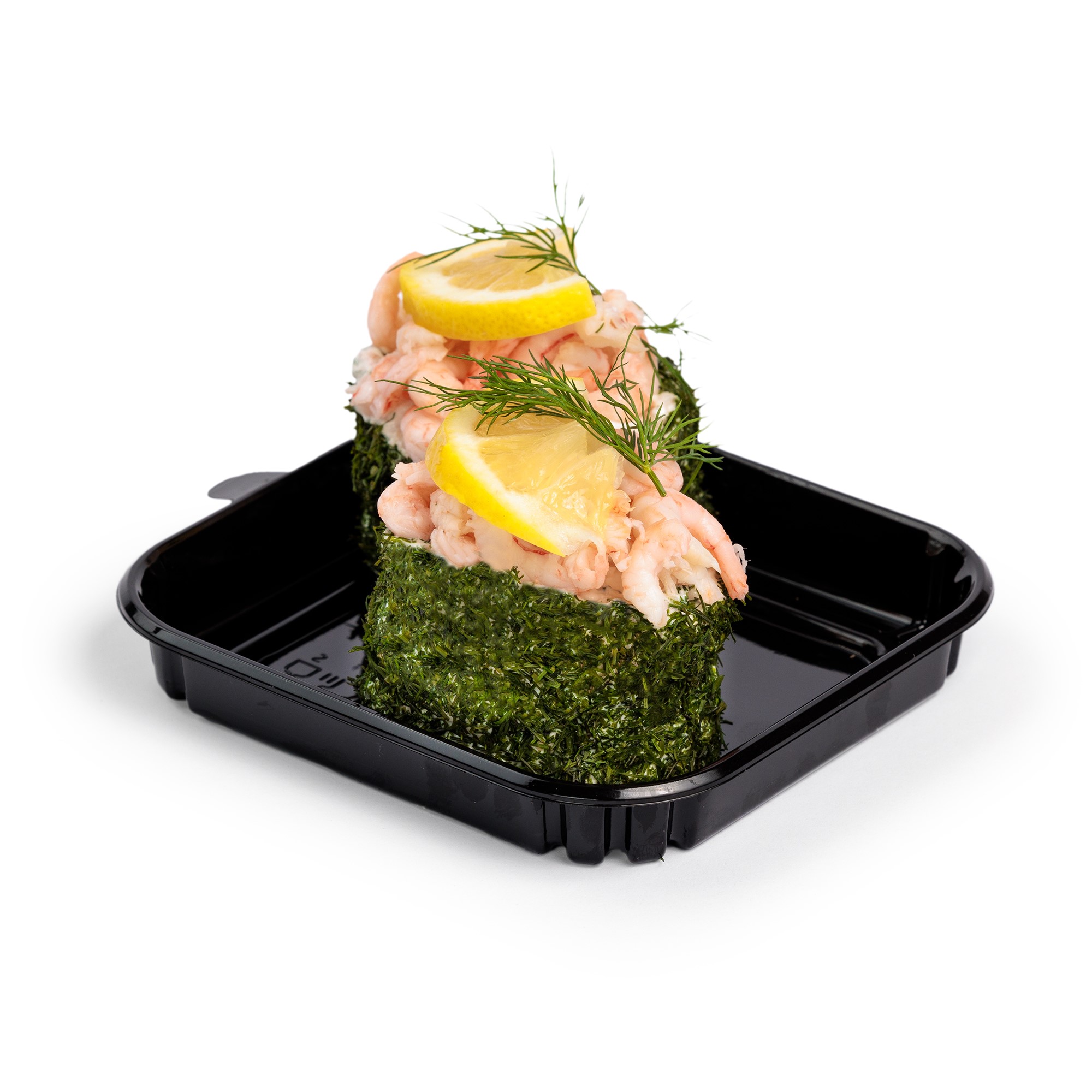 Ingrediensförteckning: Landgångsbröd mörk (VETEMJÖL, vatten, RÅGSURDEG, rapsolja, siktat RÅGMJÖL, svart sirap, maltextrakt (KORNmalt, vatten, VETEmalt), jäst, VETEGLUTEN, salt), skagenröra till tårta (majonnäs green hill (rapsolja, vatten, ÄGGULA, socker, salt, ättika, SENAPSFRÖ, chili, konserveringsmedel (E202, E211,E270), förtjockningsmedel (E412, E415)), färskskalade räkor (skalade RÄKOR (Pandalus borealis), vatten, salt, surhetsreglerande medel citronsyra, konserveringsmedel (E202, E211), Fiskad i Nordostatlanten FAO27, 27.I.b med bottentrål), philadelphia laktosfri (MJÖLK, GRÄDDE, salt, stabiliseringsmedel (fruktkärnmjöl), bakteriekultur), dill, citron pressad (citronjuice från koncentrat, konserveringsmedel (E224 innehåller SULFIT)), salt (salt, klumpförebyggandemedel (E535)).), handskalade räkor (RÄKOR(pandalus borealis), vatten, salt, surhetsreglerande medel (E330, E331), konserveringsmedel (E211,E202), socker, Fångstområde: Nordvästatlanten (FAO 21)), citron, dill. Mini Räkbakelse pyramid 150g 12% Räkor. Näringsdeklaration: Per 100 gram Energi 1357 kj (324 kcal), Fett 22 gram, varav mättat fett 1.8 gram, Kolhydrat 20 gram, varav sockerarter 1.7 gram, Protein 11 gram, Salt 1.8 gram