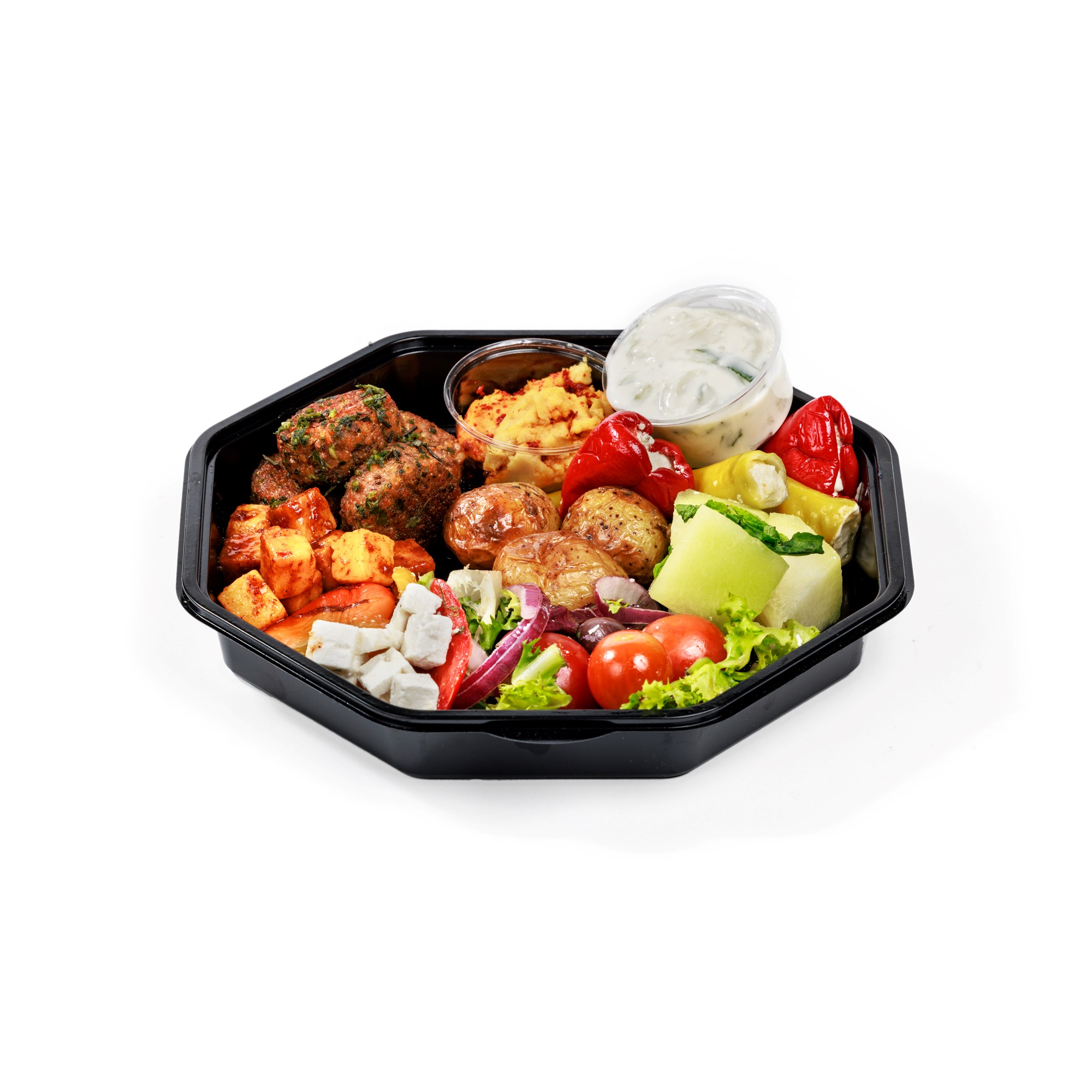 Grekisk sallad (cocktail tomat, grekisk fetaost  (Pastöriserad får och getMJÖLK, havssalt, mjölksyrakultur, vegetabiliskt ystensym), gurka, oliv kalamon (oliver, vatten, havssalt, vinäger, oliv eller solrosolja), rödlök, salladsmix (frissesallad, rosesallad), vinegrette (olivolja/rapsolja mix (Svensk pressad rapsolja, extra virgin olivolja), vatten, vitvinsvinäger (vitvinsvinäger, antioxidationsmedel), persilja, salt (salt, klumpförebyggandemedel (E535)), svartpeppar.).), mung bean bites (mungbönor, ris, lök, vitlök, mald koriander, spiskummin, bockhornsklöver, cayennepeppar, lagerblad, salt, rödbetor), kulpotatis med skal, galiamelon, färskostfyll peperoni (pepperoni, FETAOST(pastöriserad får och GETMJÖLK,löpe,havssalt,startkultur,stabiliseringsmedel(E509)), Dansk VITOST(pastöriserad KOMJÖLK,salt,vegetabiliskt ystenzym,startkultur)), vegetabilisk olja (oliv/raps), paprikapulver, vitlökspuré, torkad vitlök, oregano, basilika, konserveringsmedel (E202, E211)), färskostfylld paprika (röd paprika 33% (röd paprika, vatten, salt, surhetsreglerande medel (citronsyra), kalciumklorid, konserveringsmedel (E211)), OST 33% (ost av får- och koMJÖLK, basilika, oregano, vitlök, surhetsreglerande medel (mjölksyra), konerveringsmedel (E202)), solrosolja, grön paprika.