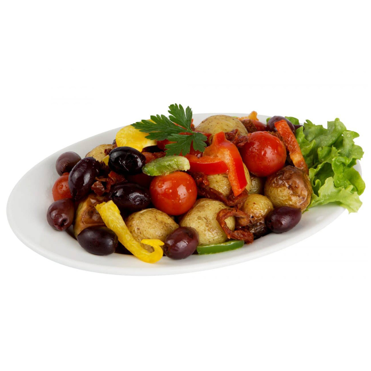 Italiensk rostad potatissallad – lösvikt (kulpotatis med skal, oliv kalamon (oliver, vatten, havssalt, vinäger, oliv eller solrosolja), strimlad soltorkade tomater (rehydrerade tomater, solrosolja, salt, torkad vitlök, lök, oregano, persilja, surhetsreglerande medel (citronsyra), antioxidationsmedel (askorbinsyra)), paprika röd, rapsolja, salt (salt, klumpförebyggandemedel (E535)), persilja.). Italiensk rostad potatissallad – Lösvikt 78% Potatis, 6.5% Soltokad tomat.