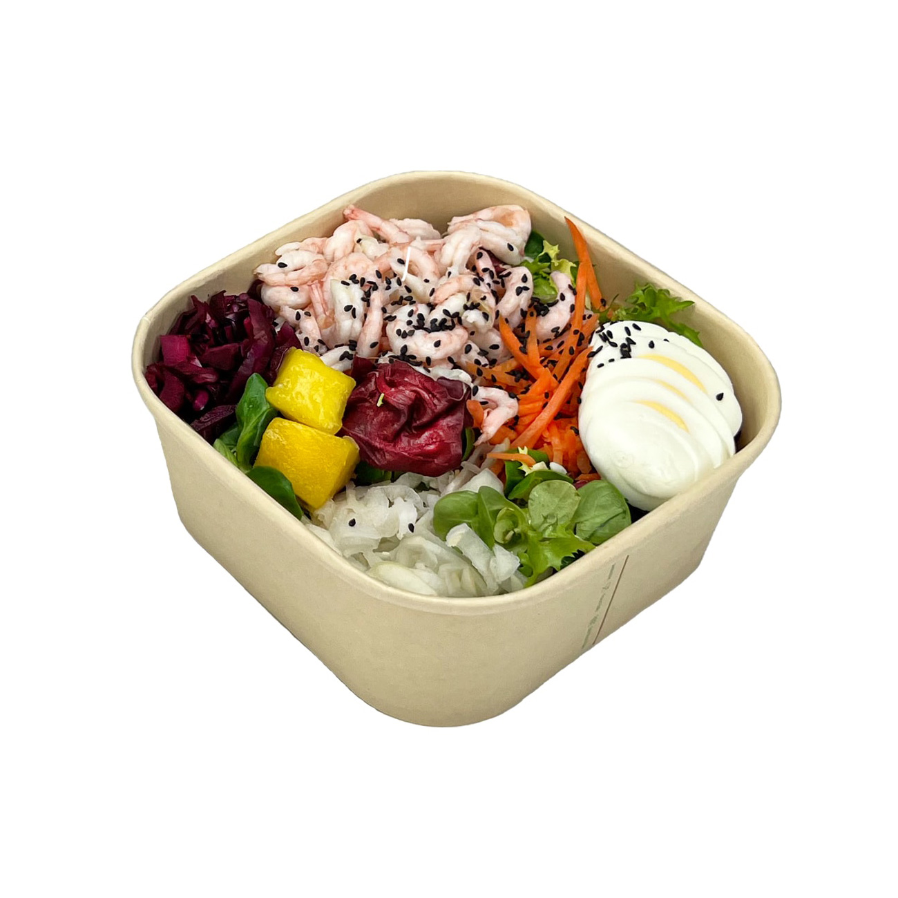 Färskskalade räkor (skalade RÄKOR (Pandalus borealis), vatten, salt, sötningsmedel (E420, alt E954), surhetsreglerande medel (E330), konserveringsmedel (E202, E211), antioxidationsmedel (E300)), svart ris, kokt ägg (ÄGG, vatten, salt, syra (citronsyra)), julienne mix (broccoli, morot, rödbetor), mango, picklad rödkål (rödkål, socker, ättika, vatten, salt), salladsmix (frissesallad, rosesallad), svarta SESAMFRÖ, salt (salt, klumpförebyggandemedel (E535)). Bowl med räkor 19% Räkor.