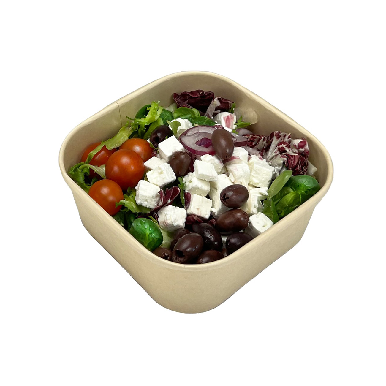 Salladsmix (frissesallad, rosesallad), salladsost (pastöriserad MJÖLK, salt, syrningskultur, ystenzym, kalciumklorid, saltlake (vatten, salt, kalciumklorid, surhetsreglerande medel E270)), cocktail tomat, oliv kalamon (oliver, vatten, havssalt, vinäger, oliv eller solrosolja), gurka, rödlök. Grekisk sallad 36% Sallad, 29% Ost.