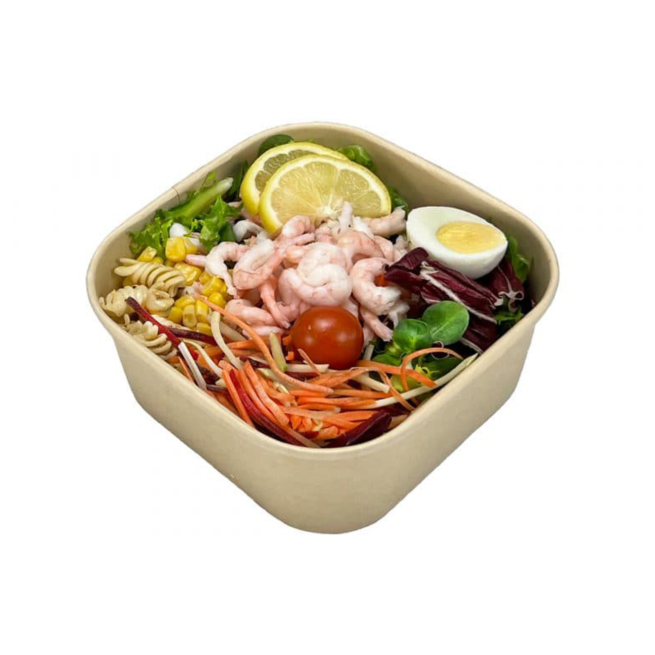 Örtmarinerad trivilini (pasta (DURUMVETE, vatten) marinad (vatten, rapsolja, salt, vitvinsvinäger, äppeljuice, krydda (svartpeppar, paprika, ingefära, vitlök, chilipeppar, spiskummin, cayennepeppar), konserveringsmedel (E202, E211), modifierad potatisstärkelse, lök, tomat, jästextrakt, paprikaextrakt, örter (persilja, gräslök, oregano, timjan, basilika, koriander)), färskskalade räkor (skalade RÄKOR (Pandalus borealis), vatten, salt, sötningsmedel (E420, alt E954), surhetsreglerande medel (E330), konserveringsmedel (E202, E211), antioxidationsmedel (E300)), kokt ägg (ÄGG, vatten, salt, syra (citronsyra)), salladsmix (frissesallad, rosesallad), cocktail tomat, citron, julienne mix (broccoli, morot, rödbetor). Pastasallad räkor (FS) 38% Pasta, 24% Räkor.