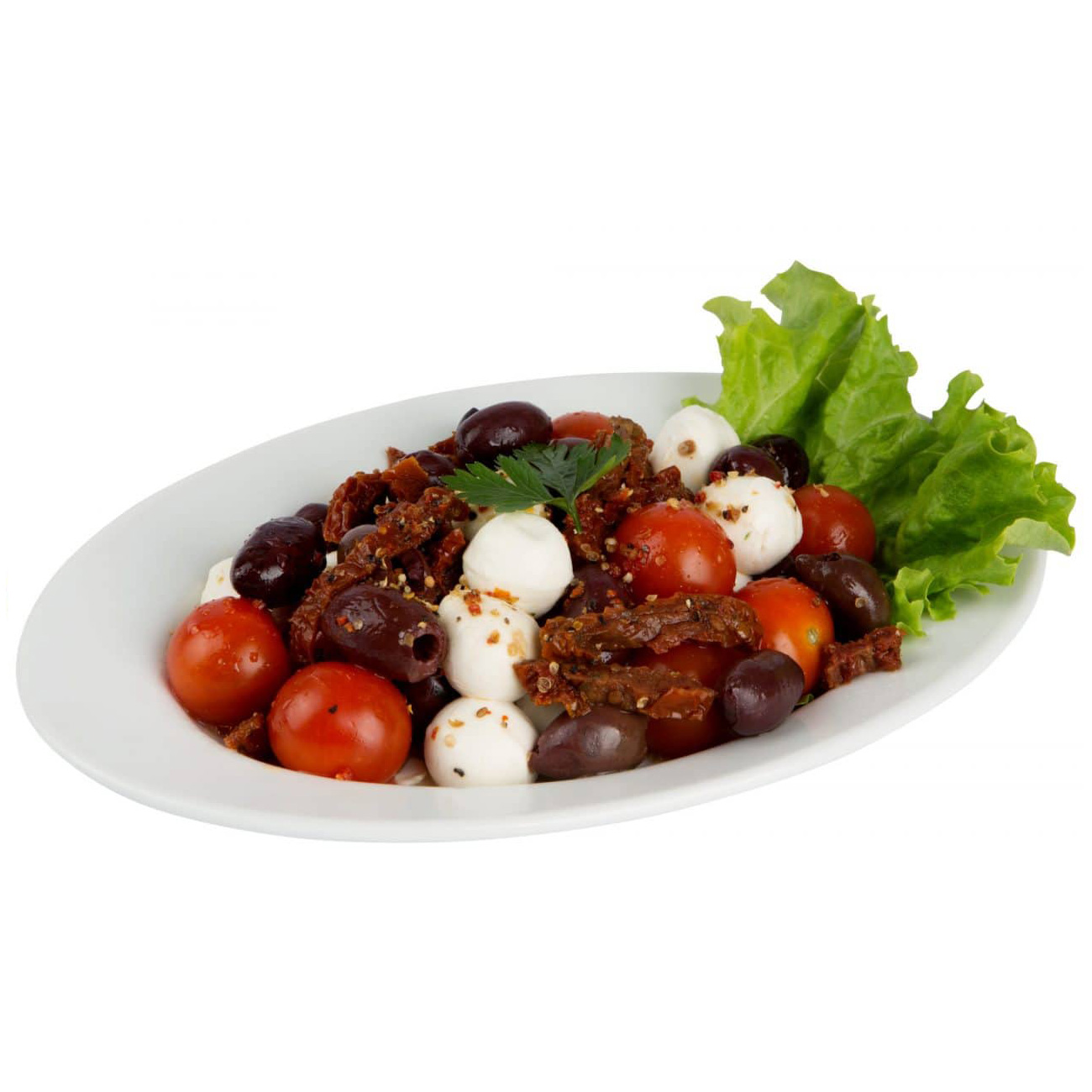 Cocktail tomat, mozzarella cocktail (pastöriserad KOMJÖLK, mellanMJÖLK, salt, mikrobiell koaguleringsmedel, surhetsreglerande medel (citronsyra)), oliv kalamon (oliver, vatten, havssalt, vinäger, oliv eller solrosolja), olivolja/rapsolja mix (Svensk pressad rapsolja, extra virgin olivolja, antioxidant (rosmarin extrakt)), pepparmix (svartpeppar, salt, SENAPSFRÖ, röd paprika, lök, cayennepeppar, koriander, ROTSELLERI, kryddpeppar). Tomat & Mozzarella – Lösvikt 43% Tomat, 36% Mozzarella.