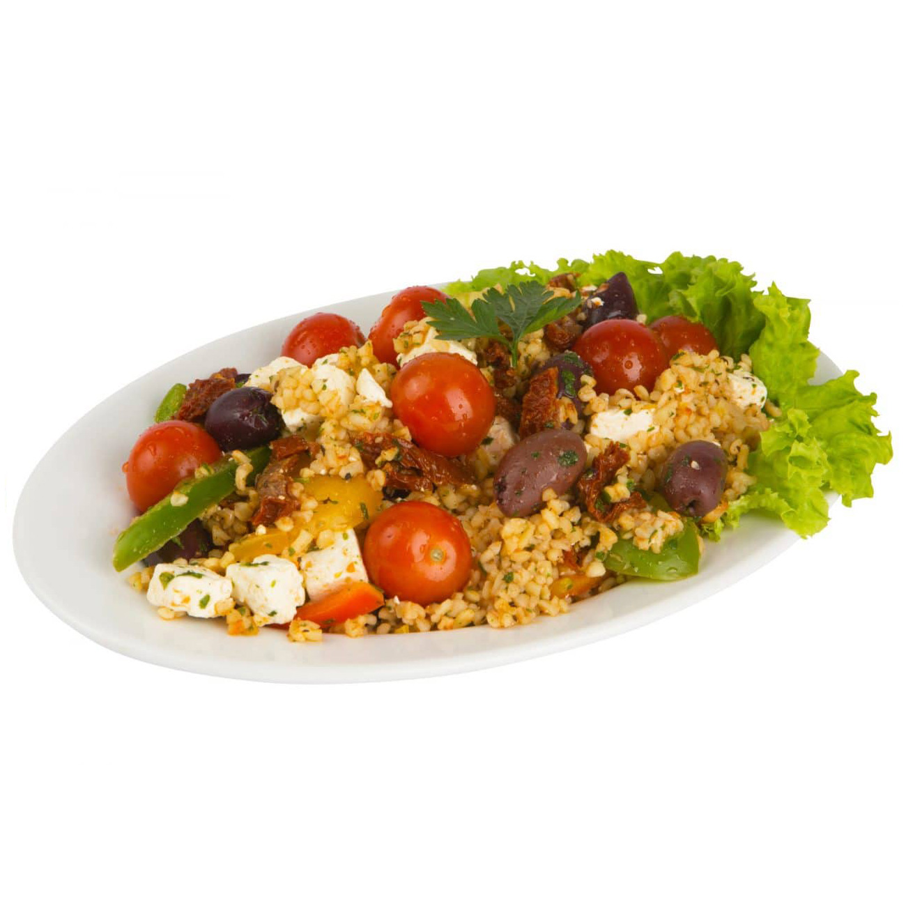 Bulgur naturell marinad (BULGUR, marinad (vatten, salt, rapsolja, vitvinsvinäger, modifierad potatisstärkelse, konserveringsmedel (E202,E211)), salladsost (pastöriserad MJÖLK, salt, syrningskultur, ystenzym, kalciumklorid, saltlake (vatten, salt, kalciumklorid, surhetsreglerande medel E270)), cocktail tomat, paprika röd, oliv kalamon (oliver, vatten, havssalt, vinäger, oliv eller solrosolja), strimlad soltorkade tomater (rehydrerade tomater, solrosolja, salt, torkad vitlök, lök, oregano, persilja, surhetsreglerande medel (citronsyra), antioxidationsmedel (askorbinsyra)), persilja. Vegetarisk Bulgur – Lösvikt 68% Bulgur, 8.5% ost.