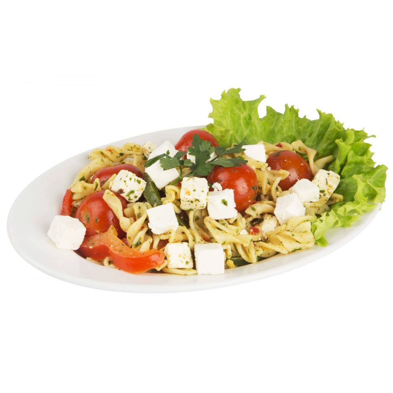 Örtmarinerad trivilini (pasta (DURUMVETE, vatten) marinad (vatten, rapsolja, salt, vitvinsvinäger, äppeljuice, krydda (svartpeppar, paprika, ingefära, vitlök, chilipeppar, spiskummin, cayennepeppar), konserveringsmedel (E202, E211), modifierad potatisstärkelse, lök, tomat, jästextrakt, paprikaextrakt, örter (persilja, gräslök, oregano, timjan, basilika, koriander)), salladsost (pastöriserad MJÖLK, salt, syrningskultur, ystenzym, kalciumklorid, saltlake (vatten, salt, kalciumklorid, surhetsreglerande medel E270)), cocktail tomat, paprika röd, oliv kalamon (oliver, vatten, havssalt, vinäger, oliv eller solrosolja), strimlad soltorkade tomater (rehydrerade tomater, solrosolja, salt, torkad vitlök, lök, oregano, persilja, surhetsreglerande medel (citronsyra), antioxidationsmedel (askorbinsyra)), persilja. Vegetarisk pasta – Lösvikt 68% Pasta, 8.5% Ost.